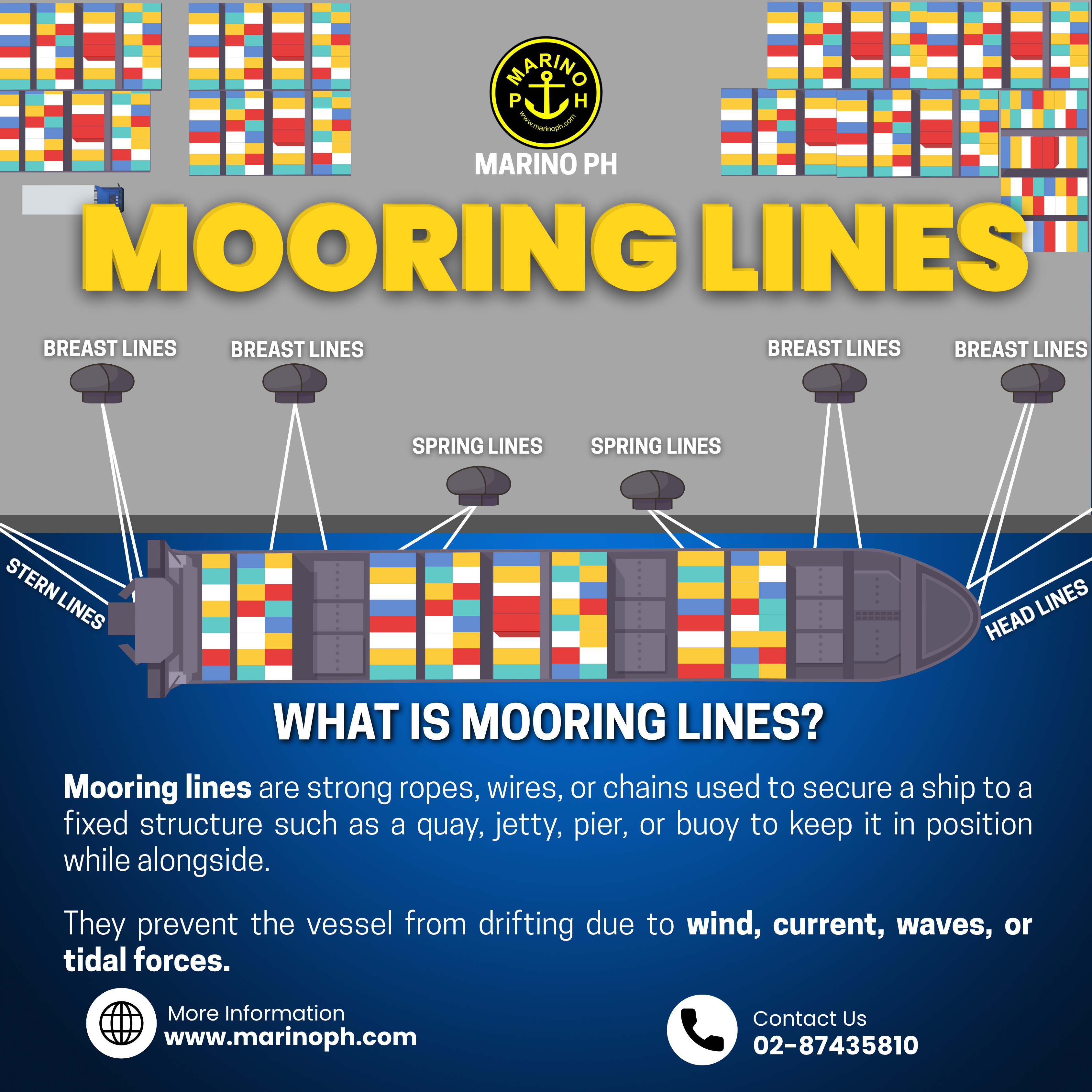 Mooring lines are vital for securing a vessel to a fixed structure, such as a dock or pier, ensuring stability and safety against environmental forces like wind, waves, and currents. Whether you're a seasoned mariner or a cadet, understanding the types and uses of mooring lines is essential for safe operations. Types of Mooring Lines and Their Purposes: ⁍ Head Lines These lines extend from the bow (front) of the ship at an angle to the dock. Their primary job is to prevent the ship from moving backward and keep the bow steady near the dock. ⁍ Stern Lines Stern lines are led from the stern (back) of the ship at an angle to the dock. They ensure the stern remains secure and prevent forward movement. ⁍ Breast Lines Breast lines run nearly perpendicular to the ship, connecting it to the dock at a 90-degree angle. These lines hold the vessel close to the dock, countering forces that could pull it away, like tides or strong winds. ⁍ Spring Lines These lines run almost parallel to the ship’s hull and are crucial for preventing longitudinal movement. Forward Spring Lines: Stop the ship from drifting backward. Aft Spring Lines: Prevent the ship from moving forward. Materials Used for Mooring Lines: ⁍Synthetic Fibers Common materials: Nylon, Polyester, and Polypropylene. Benefits: Lightweight, durable, resistant to wear, and able to absorb shock loads. ⁍ Wire Ropes Made from high-tensile steel, these ropes are incredibly strong and ideal for large ships operating in tough environments. Downsides: Require frequent maintenance and are less flexible compared to synthetic ropes. ⁍ Natural Fibers Traditional materials like manila and sisal. Pros: Biodegradable. Cons: Susceptible to rot and less durable compared to synthetic options. Why Are Mooring Lines So Important? ⁍Proper mooring arrangements are critical for: ⁍Keeping the vessel stationary during cargo operations. ⁍Preventing accidents caused by drifting due to tides, waves, or weather. ⁍Ensuring the safety of the crew, the vessel, and the environment. ⁍Pro Tip: Regular inspection of mooring lines is essential to prevent failures. Always check for wear and tear, fraying, or weakening of the ropes, especially in synthetic and natural fibers. Quick Safety Reminder: Mooring operations can be dangerous. Always: ⁍Follow your ship's safety procedures and guidelines. ⁍Keep clear of snapback zones. ⁍Use proper personal protective equipment (PPE) during mooring.