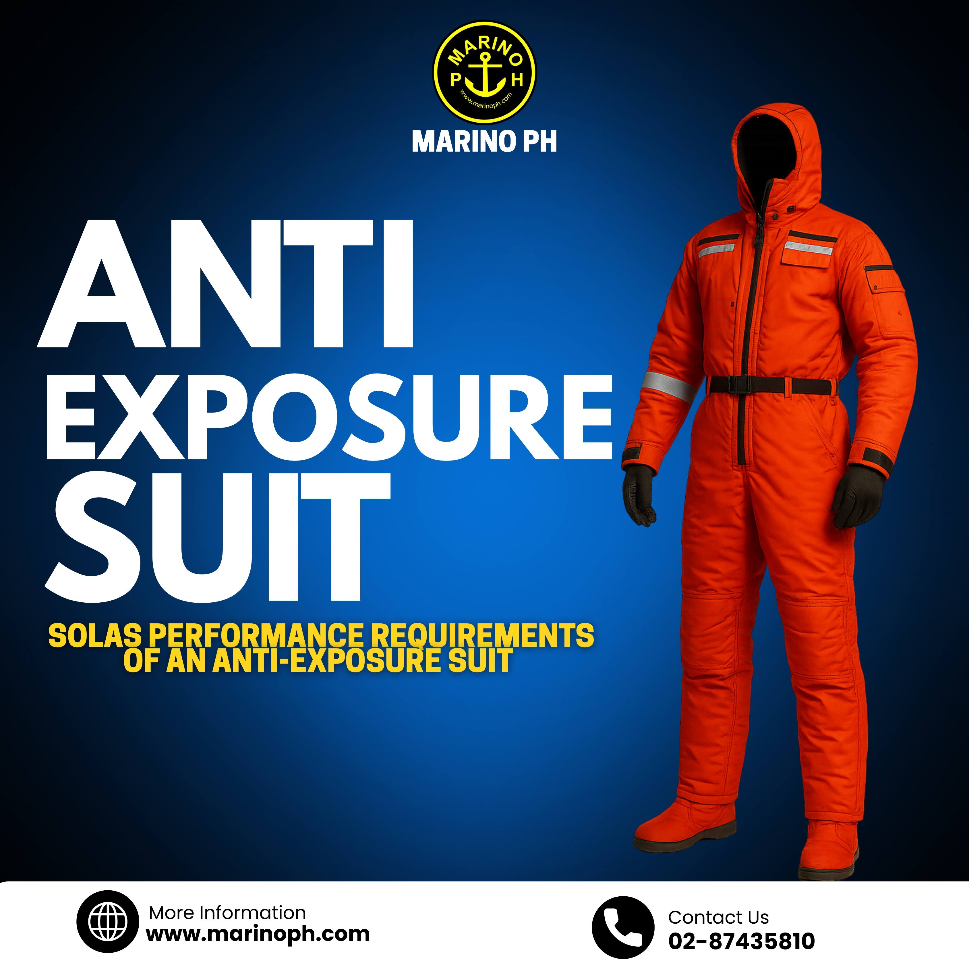 An anti-exposure suit is a specialized protective garment used in the maritime environment to safeguard individuals from the dangers of cold water, extreme weather, and emergency situations at sea. It is typically bright orange for high visibility and made from waterproof, fire-resistant materials that help reduce heat loss and protect the wearer from harsh conditions while performing rescue or evacuation duties. Designed to cover almost the entire body except the head and hands, these suits often include gloves and a hood, and they must be capable of being put on quickly usually within 2 minutes without assistance. They provide inherent buoyancy and thermal protection so that if someone enters cold water, their body temperature drops slowly, helping prevent hypothermia. Anti-exposure suits are also built to allow the wearer to climb ladders, jump into water, swim short distances, don a lifejacket, and carry out evacuation or rescue duties effectively even under stress.