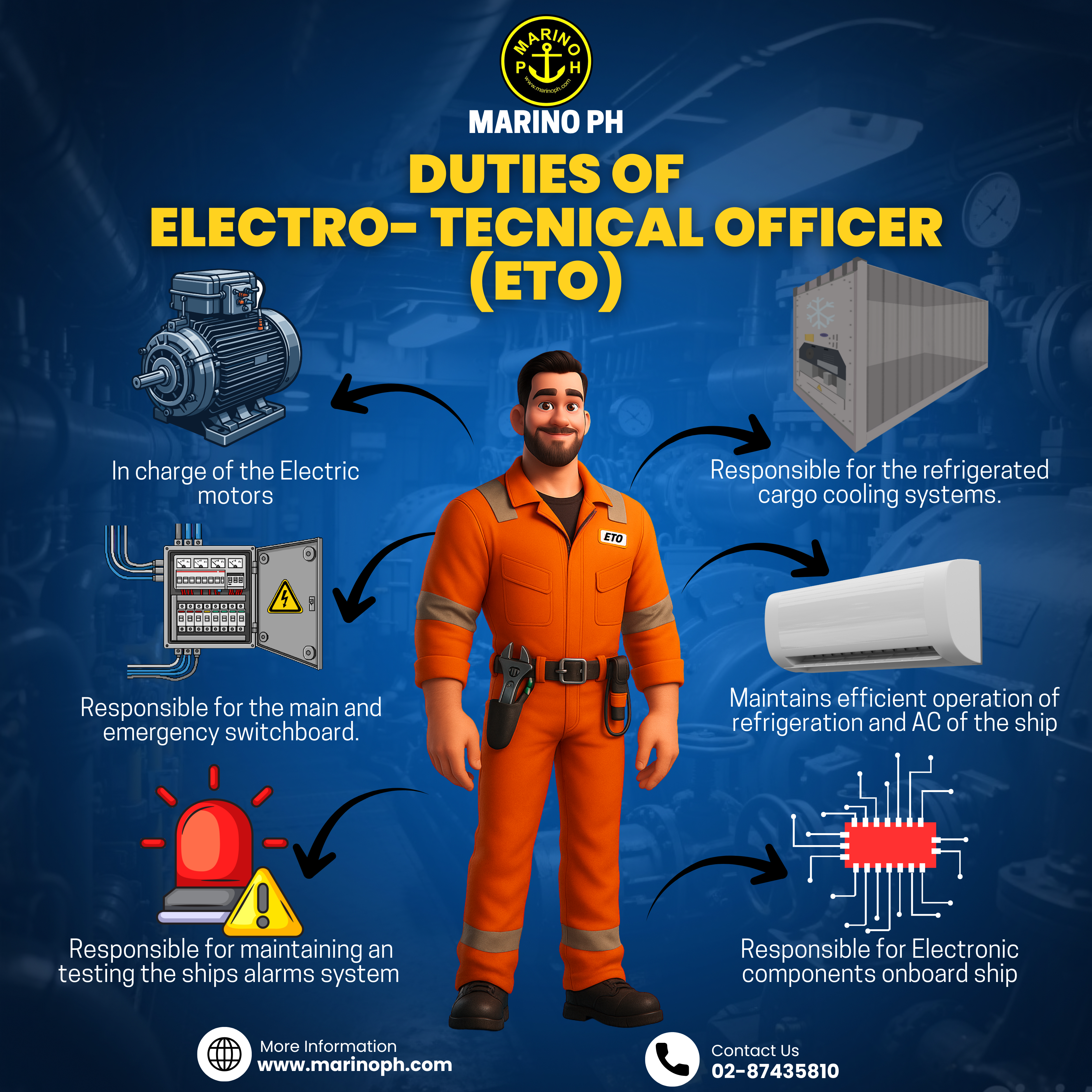Duties of an Electro-Technical Officer (ETO) An Electro-Technical Officer (ETO) plays a critical role in ensuring the safe and efficient operation of a vessel’s electrical, electronic, and automation systems. As a key member of the engine department, the ETO is responsible for maintaining essential equipment that supports navigation, cargo operations, safety systems, and onboard living conditions. The ETO is in charge of the ship’s electric motors and power distribution systems, ensuring that machinery operates reliably at all times. This includes the maintenance and monitoring of the main and emergency switchboards, which are vital for uninterrupted electrical supply during both normal operations and emergency situations.