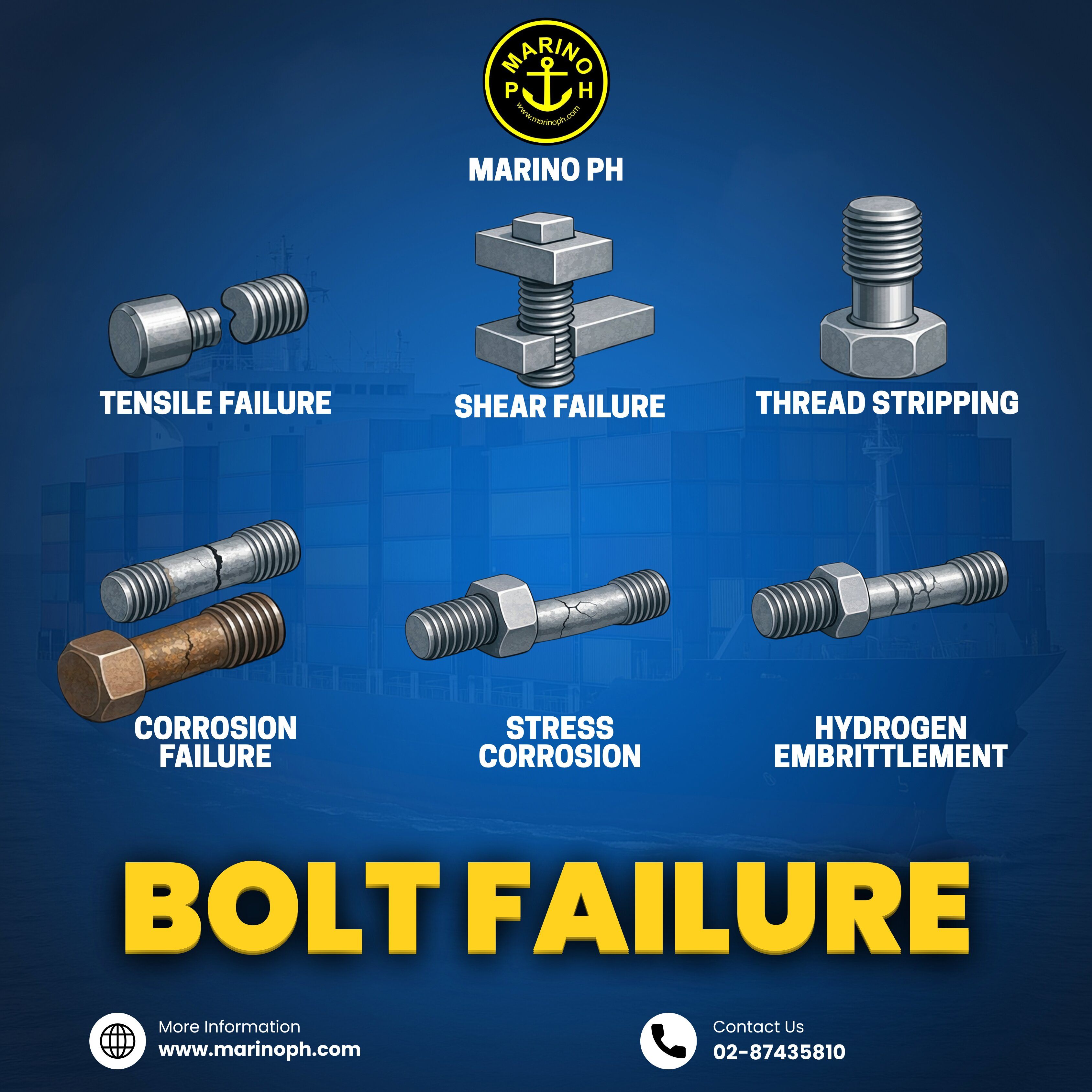 Understanding Bolt Failure: Key Types and Causes Bolts are critical components in marine, industrial, and structural applications, ensuring the integrity and safety of assemblies. However, improper installation, material defects, or environmental factors can lead to bolt failure, posing risks to equipment and personnel. Understanding the types of failures is essential for prevention and maintenance. 1. Tensile Failure – Occurs when a bolt is subjected to forces beyond its tensile strength, causing it to break or snap. 2. Shear Failure – Happens when forces act perpendicular to the bolt’s axis, cutting it across its cross-section. 3. Thread Stripping – Results from excessive torque or wear, damaging the bolt threads and preventing secure fastening.
