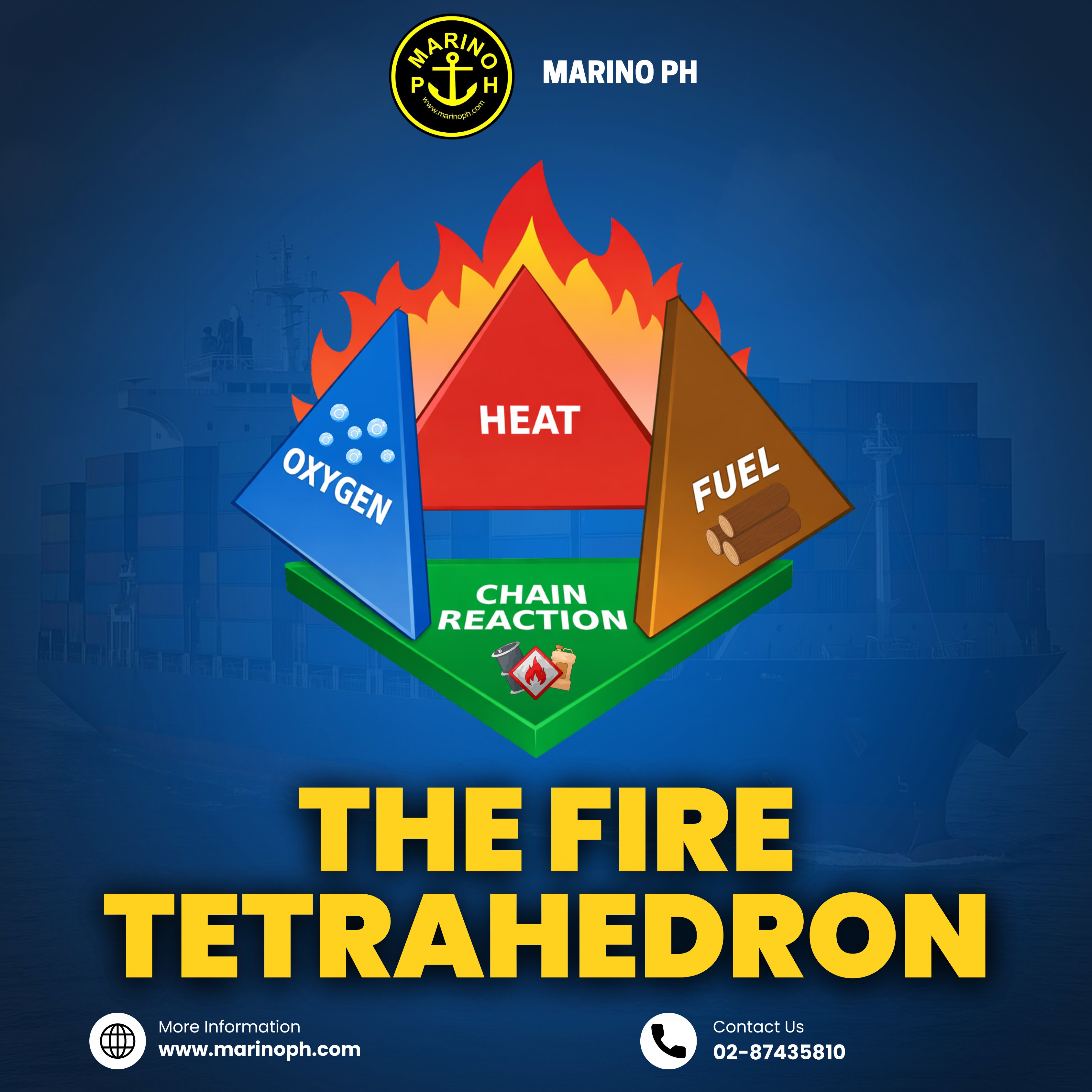The Fire Tetrahedron: Understanding the Science Behind Fire Fire is one of the most significant hazards onboard ships and in industrial workplaces. To effectively prevent and control it, we must first understand how it starts. The Fire Tetrahedron explains the four essential elements required for a fire to ignite and continue burning: heat, fuel, oxygen, and a chemical chain reaction. Unlike the traditional “fire triangle,” which includes only heat, fuel, and oxygen, the fire tetrahedron adds a fourth component the chain reaction. This chemical process sustains combustion at the molecular level. Removing any one of these four elements will prevent a fire from starting or will extinguish an existing one. The Four Elements of the Fire Tetrahedron 1. Heat Heat provides the energy needed to raise materials to their ignition temperature. Onboard vessels, heat sources may include electrical faults, hot work operations, engine components, friction, or open flames. 2. Fuel Fuel is any combustible material such as oil, fuel residues, lubricants, cargo, wood, paper, plastics, or flammable gases. Ships contain numerous fuel sources, making proper storage and housekeeping critical. 3. Oxygen Oxygen supports combustion. In most environments, the air contains about 21% oxygen more than enough to sustain a fire. Enclosed spaces can become especially dangerous if oxygen levels are uncontrolled. 4. Chain Reaction This is the self-sustaining chemical reaction that keeps the fire burning. Certain fire extinguishing agents, such as dry chemical powder, work by interrupting this reaction, effectively stopping the fire even if heat and fuel are still present.