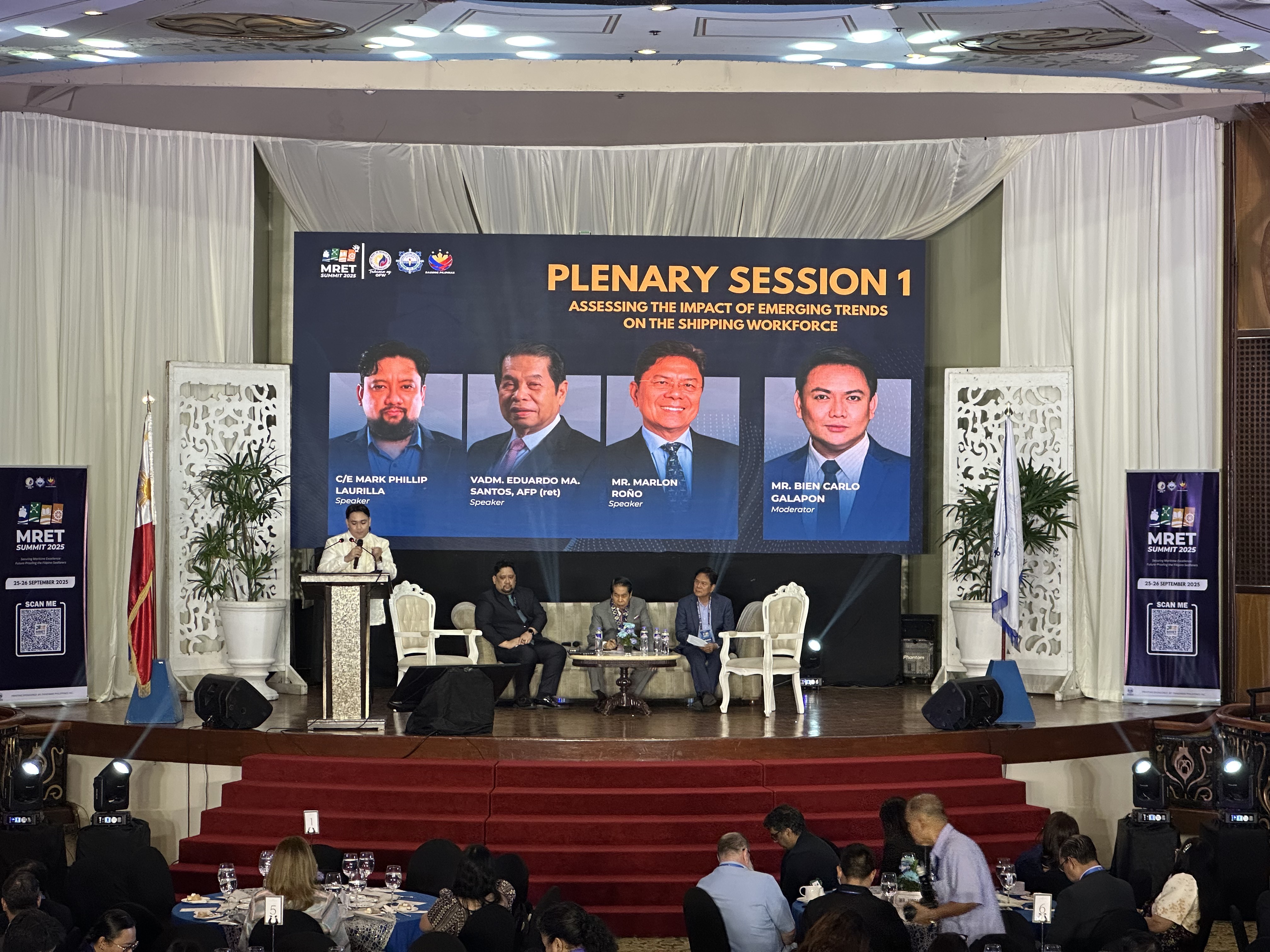 Plenary Session 1 tackled pressing global shifts affecting the shipping workforce. C/E Mark Philip Laurilla (PHILCAMSAT) spoke on decarbonization and a just transition for seafarers. Vadm. Eduardo Ma. R. Santos (MAAP) presented how digitalization and automation drive innovation, while Mr. Marlon Roño (PJMCC) addressed the impacts of changing global trade patterns. Moderated by Mr. Bien Carlo Galapon , the panel emphasized that Filipino seafarers must adapt quickly to technological disruptions, environmental regulations, and global market demands to remain competitive. The discussions urged alignment of training and policies with these fast-evolving industry shifts