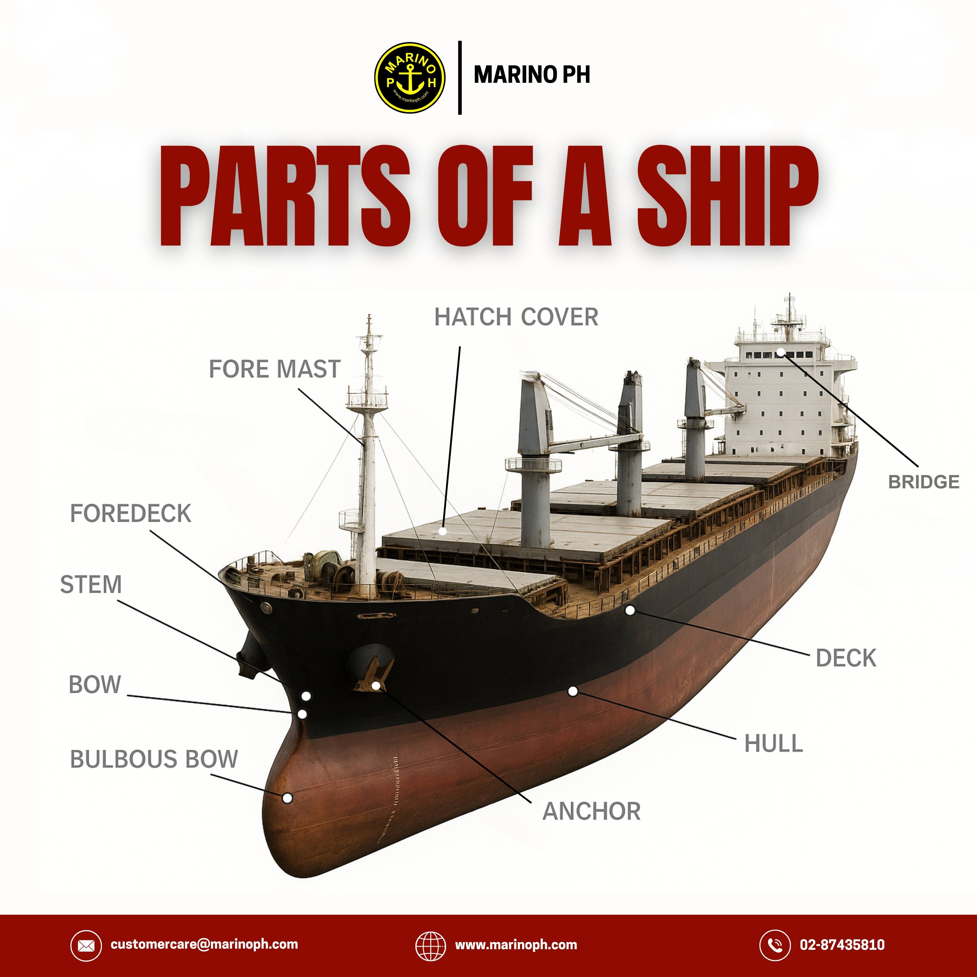 Front (Bow) Area Bulbous Bow A rounded projection located below the waterline at the forward part of the hull. It reduces wave resistance and helps improve the ship’s fuel efficiency and stability. Bow The forward-most section of the ship designed to cut through the water as the vessel moves. Stem The vertical front edge of the bow that forms the main support where the two sides of the hull meet. Foredeck The deck area located at the forward part of the ship, often used for anchor handling and mooring operations. Fore Mast A mast positioned near the bow used to mount lights, radar, antennas, and other navigational instruments. Hatch Cover A watertight cover placed over cargo holds to protect the cargo from seawater and weather exposure. Deck The main working platform of the ship where crew activities and operations take place. Hull The main outer structure or body of the ship that provides buoyancy and keeps the vessel afloat. Anchor A heavy device lowered to the seabed to hold the ship in position and prevent drifting. Bridge The command center of the ship where navigation, control, and monitoring of vessel movement and operations are performed. Midship and Superstructure Superstructure The portion of the ship constructed above the main deck, housing key operational and living spaces. Accommodation The area where the crew lives and works. It includes cabins, mess rooms, offices, and other essential living facilities. Flying Bridge / Bridge Wings Side platforms extending from the bridge used for maneuvering and observation, especially during docking and unmooring. Monkey Island An open platform located above the bridge that provides access to radar, communication, and navigation equipment, as well as offering an unobstructed view of the surroundings. Main Mast The primary mast supporting communication systems, navigation lights, and other electronic devices.