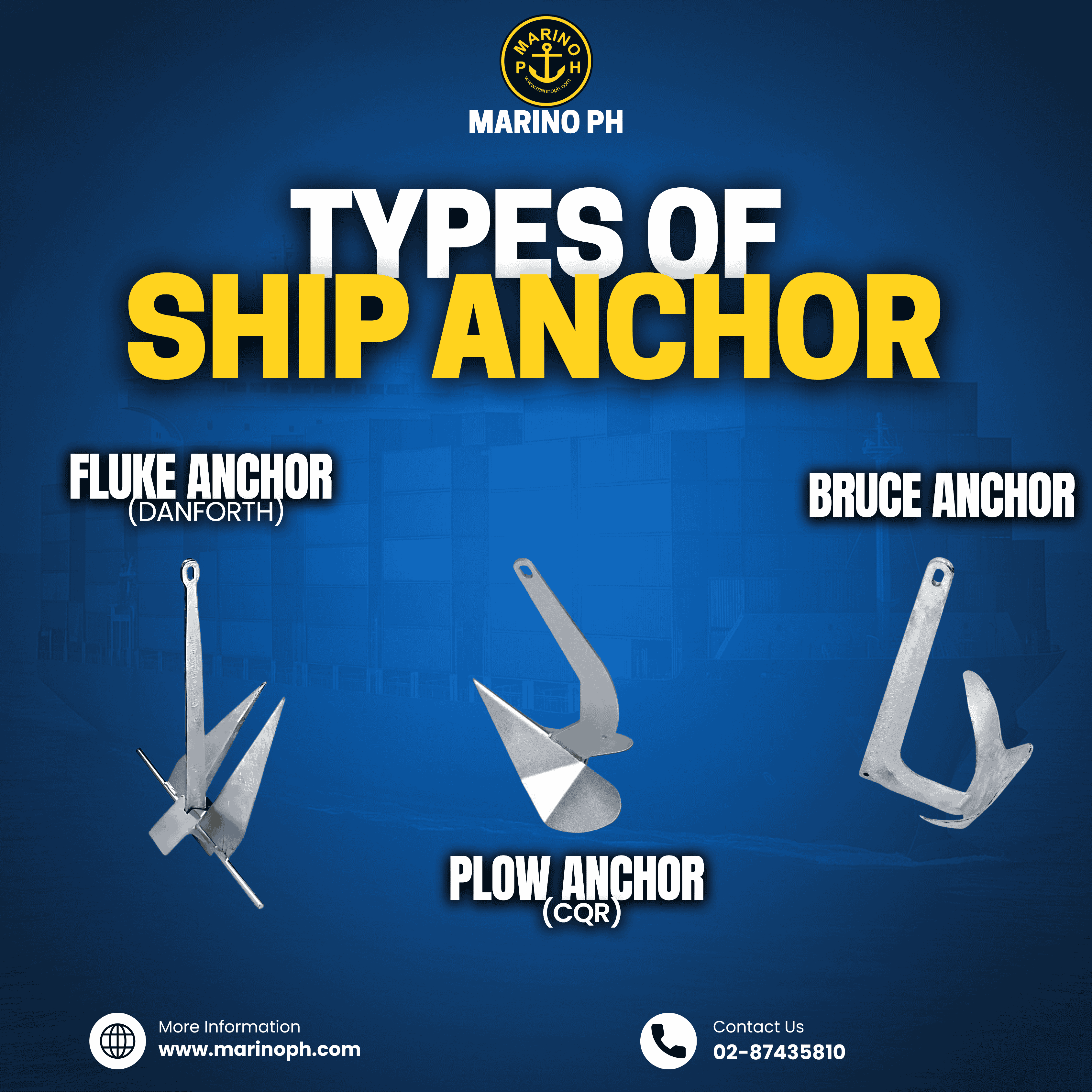 What is anchor? An anchor is a heavy device, typically made of metal, that is used to connect a vessel to the bed of a body of water to prevent the vessel from drifting due to wind or current. Purpose ‣To Hold the Vessel in Place It secures the ship in a fixed location, especially when it is not at a dock or port. ‣To Prevent Drifting It stops the vessel from being carried away by wind, waves, or currents. ‣To Provide Safety in Emergencies In case of engine failure or rough weather, the anchor helps prevent the ship from drifting into danger. ‣To Assist in Positioning During Operations Useful for activities like dredging, diving, or repairs where stability is essential. 1. Fluke Anchor (Danforth) The Fluke anchor, also known as the Danforth anchor, is a lightweight, high-holding power anchor designed with two wide flat flukes that pivot on a shank. Purpose: It is ideal for anchoring in sandy or muddy bottoms, where its broad flukes can dig in deeply and hold firmly. Key Features: ‣Made of high-strength steel or aluminum ‣Lightweight and easy to handle ‣Excellent holding power relative to its weight ‣Commonly used on smaller vessels, yachts, and recreational boats 2. Plow Anchor (CQR) The Plow Anchor, commonly known as the CQR anchor (short for Coastal Quick Release), features a single plow-shaped fluke that pivots on a shank, resembling a farmer’s plow. Purpose: Designed to penetrate and bury itself in a variety of seabeds, it is widely used for general-purpose anchoring, especially in changing conditions Key Features: ‣Heavy-duty forged or cast steel construction ‣Hinged design allows it to adapt to shifting loads ‣Performs well in sand, mud, gravel, and some grassy bottoms ‣Often seen on cruising and commercial vessels 3. Bruce Anchor The Bruce anchor, also known as the Claw anchor, is a one-piece anchor with a claw-like shape designed to dig into the seabed and provide steady holding power. Purpose: Developed originally for offshore oil rigs, the Bruce anchor is now popular for small to medium recreational boats due to its reliable setting and holding capabilities. Key Features: ‣Made from forged or cast steel ‣One-piece construction with no moving parts ‣Performs well in sand, mud, and some rocky bottoms ‣Commonly used by cruising yachts and powerboats
