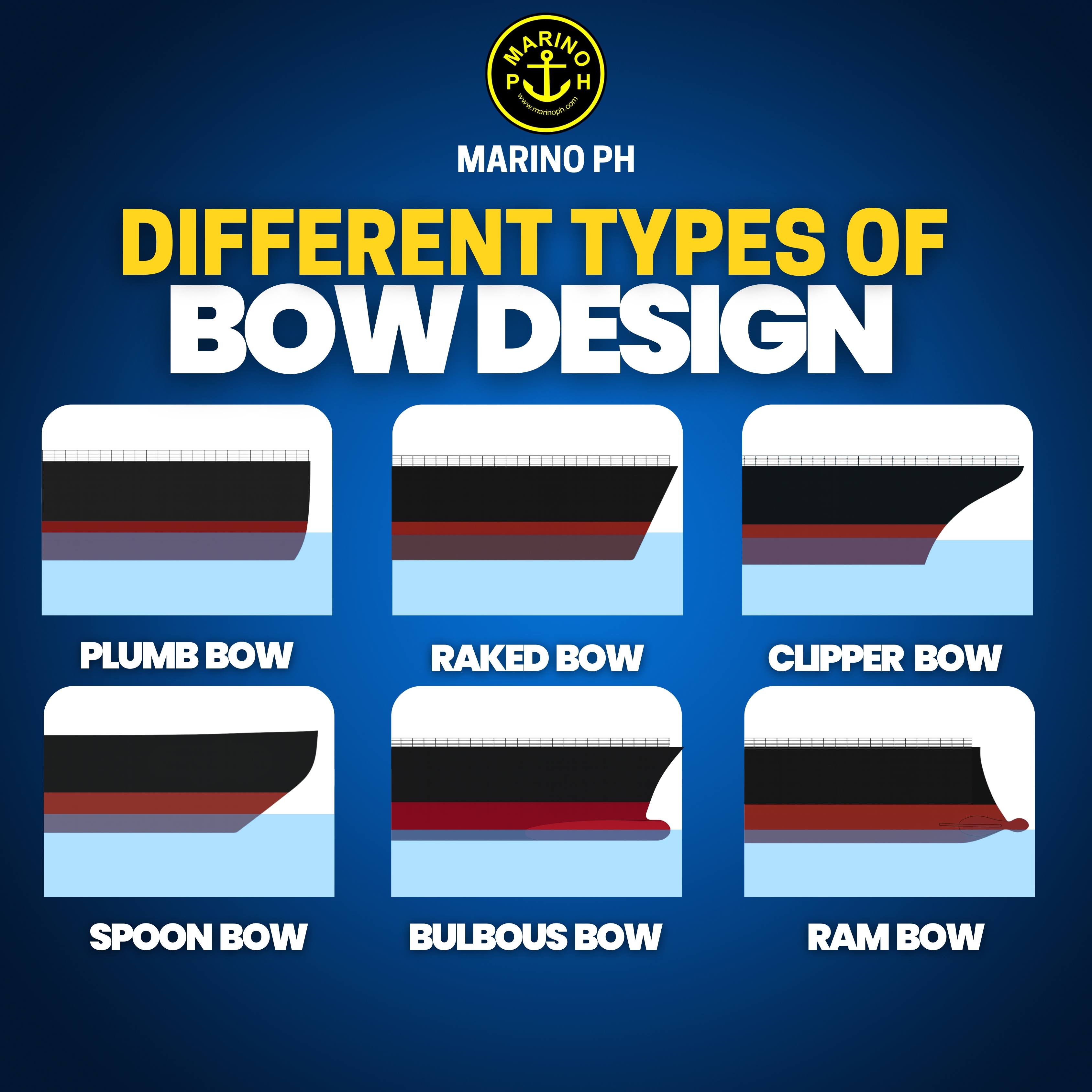 The bow is the forward-most part of a ship, designed to cut through water efficiently. Its shape affects speed, fuel efficiency, stability, and seakeeping. Different bow designs help vessels perform better in various conditions such as rough seas, ice navigation, or high-speed operations. Spoon Bow A smoothly curved bow that reduces wave resistance and improves fuel efficiency. Common on: bulk carriers, tankers, container ships, and general cargo vessels. Bulbous Bow A bow with a protruding bulb below the waterline designed to reduce drag and improve speed and fuel economy. Usually seen on: large container ships, tankers, bulk carriers, LNG/LPG carriers, and cruise ships. Ram Bow A strong, forward-projecting bow built to withstand impact, originally for naval use. Usually seen on: naval warships, ice-strengthened vessels, and some specialized research ships. Plumb Bow A nearly vertical bow that maximizes waterline length and improves speed and cargo efficiency. Usually seen on: modern container ships, passenger ships, ferries, and naval vessels. Raked Bow A backward-sloping bow that reduces spray and improves performance in rough seas. Usually seen on: tankers, bulk carriers, offshore supply vessels (OSV), and fishing vessels. Clipper Bow A long, curved bow designed to cut through waves smoothly. Usually seen on: traditional sailing ships, older passenger liners, and classic training vessels.
