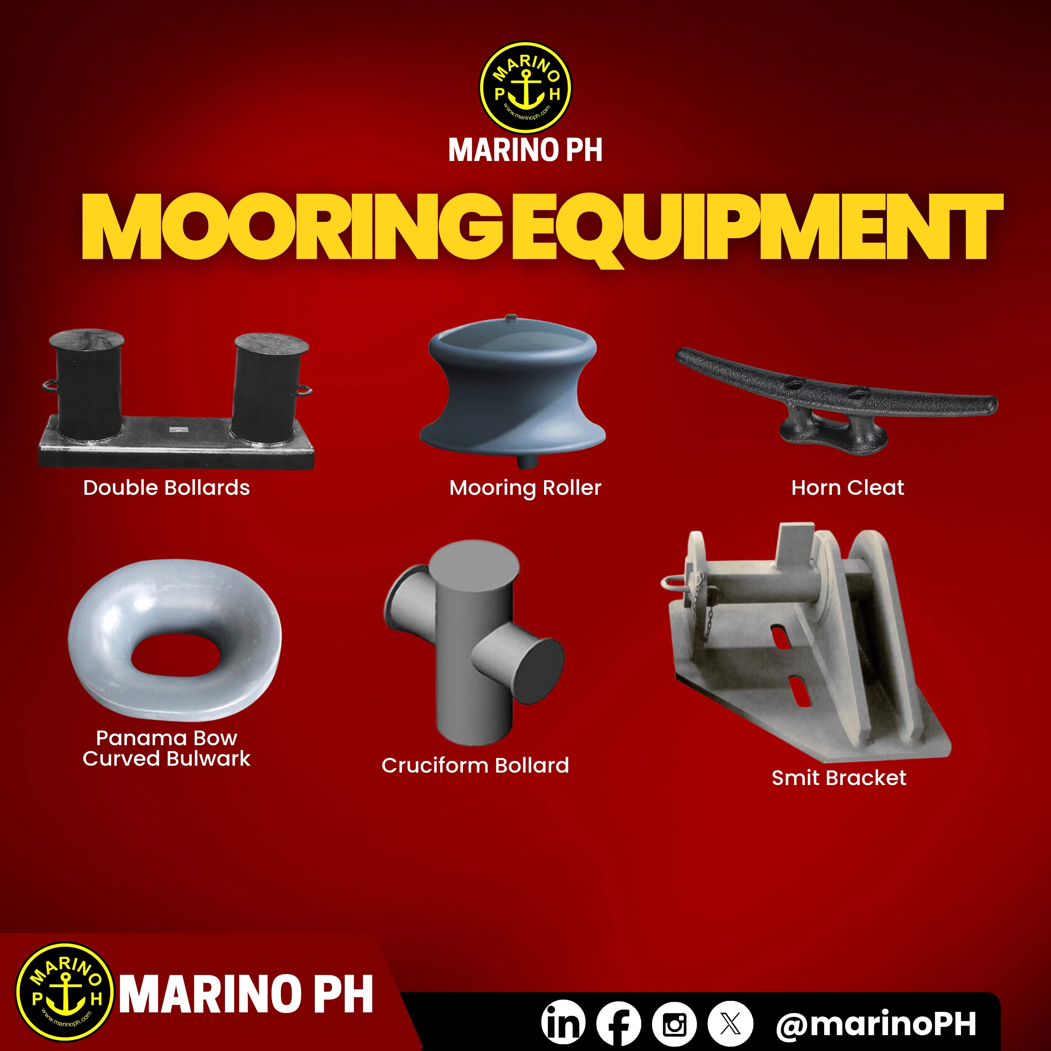 Mooring Equipment plays a critical role in ensuring the safe berthing and securing of vessels in ports and terminals. Designed to handle heavy loads and dynamic forces, these fittings guide, control, and hold mooring lines in place while minimizing wear and operational risk. Double Bollards ‣Used for securing mooring lines on deck; allows multiple lines to be fastened and provides strong holding capacity during berthing. Mooring Roller ‣Guides mooring lines smoothly during heaving or paying out, reducing friction and preventing line damage. Horn Cleat ‣Simple deck fitting used to secure light mooring lines or ropes by wrapping them around its two horns. Panama Bow Curved Bulwark ‣Reinforced bow fitting designed to guide mooring lines safely over the ship’s bulwark with minimal wear. Cruciform Bollard ‣Cross-shaped bollard that allows multiple mooring lines to be secured from different directions. Smit Bracket ‣Heavy-duty fitting used for towing operations; guides towing lines and absorbs high towing loads.