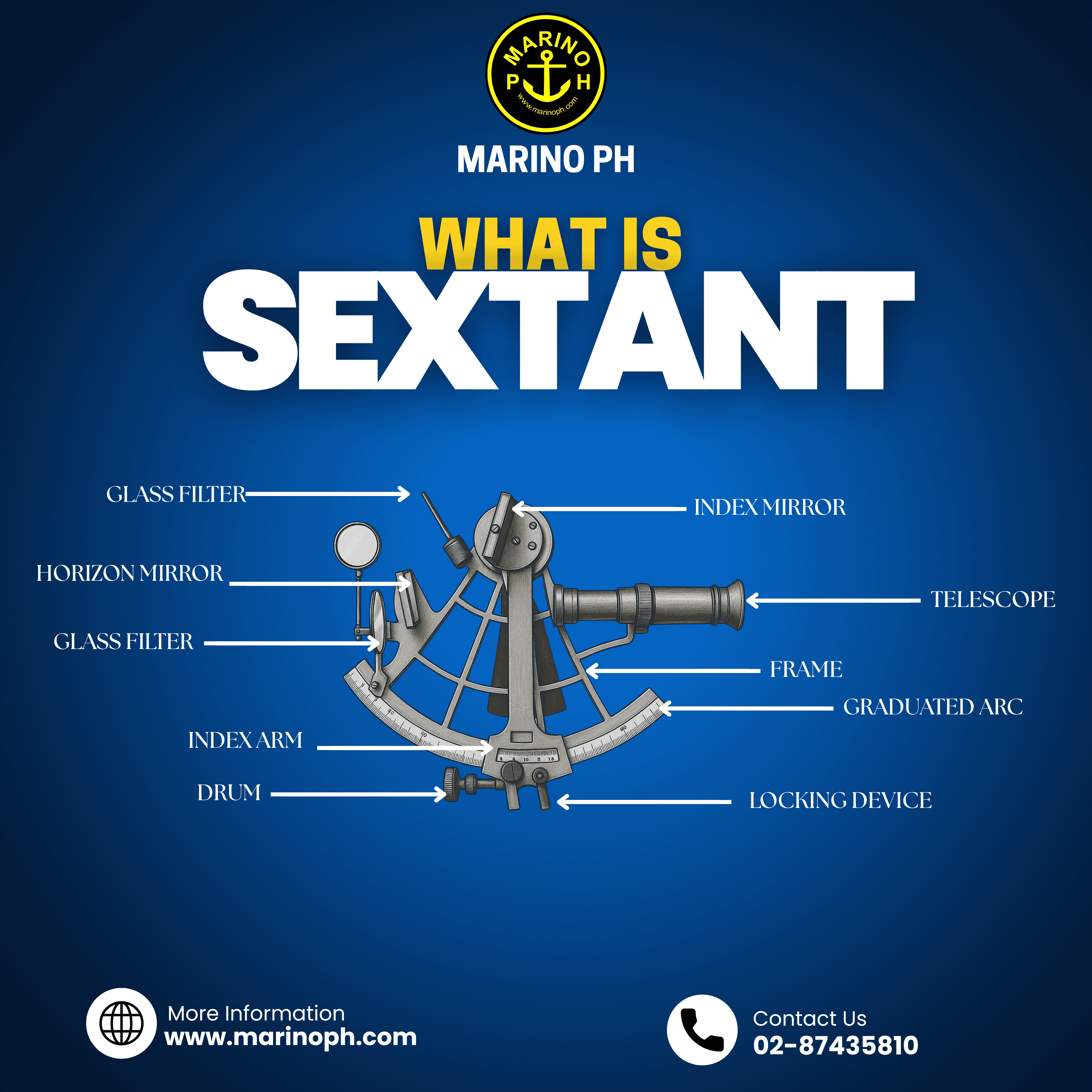 A sextant is a navigation instrument used by seafarers to measure the angle between a celestial body (sun, moon, star) and the horizon. The sextant is used to determine a ship’s position at sea, specifically latitude and longitude, by celestial navigation—especially when GPS is unavailable. Old-school, but still gold 🧭 Parts of a Sextant • Frame – The main body that supports all parts of the sextant. • Telescope – Used to view the horizon and the celestial body clearly. • Index Mirror – Reflects the image of the celestial body. • Horizon Mirror – Allows the observer to see both the horizon and reflected image at the same time. • Index Arm – Movable arm used to adjust the angle being measured. • Graduated Arc – Curved scale where angles are read in degrees. • Drum (Micrometer Drum) – Fine adjustment for precise angle readings. • Locking Device – Secures the index arm in place after adjustment. • Glass Filters – Protect the eyes when observing bright objects like the sun. A sextant is a precision navigational tool that helps mariners calculate their position at sea by measuring angles between celestial bodies and the horizon.