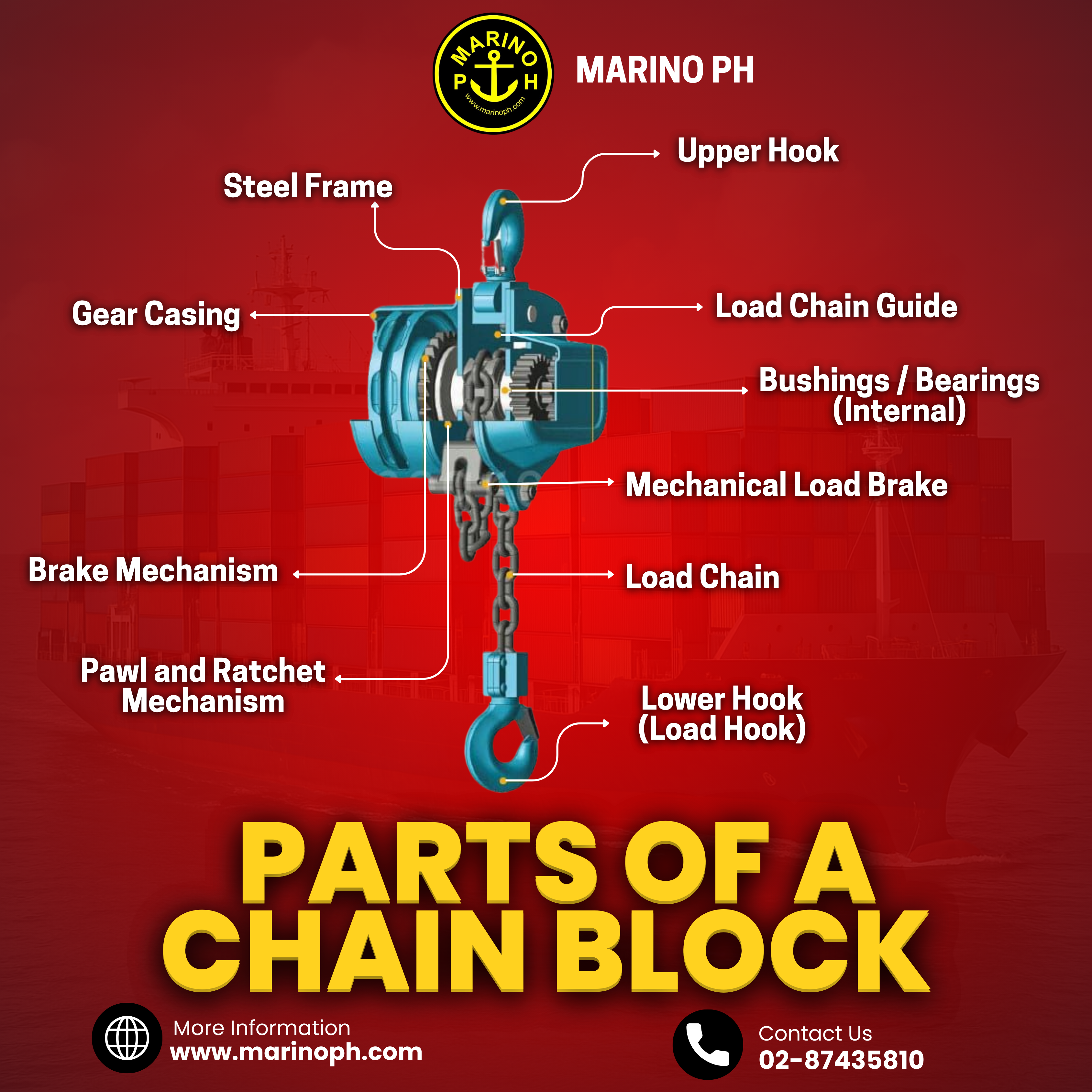 What is a chain block A chain block, also known as a manual chain hoist, is a mechanical lifting device widely used in maritime, shipyard, construction, and industrial environments. The image illustrates the key internal and external components of a chain block, including the steel frame, gear casing, load chain, braking system, hooks, and internal bearings. These parts work together to lift, lower, and hold heavy loads safely using manual force. The robust steel frame houses the internal gears and brake mechanism, while the upper hook allows secure attachment to a beam or lifting point. The load chain passes through the chain guide, ensuring smooth movement and proper alignment during operation. Inside the gear casing, bushings, bearings, and gears reduce friction and multiply force, enabling efficient lifting. Purpose The primary purpose of a chain block is to lift, suspend, and precisely position heavy loads in areas where electrical or hydraulic lifting equipment may be unavailable or impractical. In maritime operations, chain blocks are commonly used for engine maintenance, cargo handling, machinery installation, and ship repair work. The integrated mechanical load brake and pawl-and-ratchet mechanism are critical safety features. They automatically hold the load in place when lifting force is released, preventing accidental lowering and ensuring controlled, step-by-step operation. This makes chain blocks especially suitable for confined spaces and onboard ship environments.