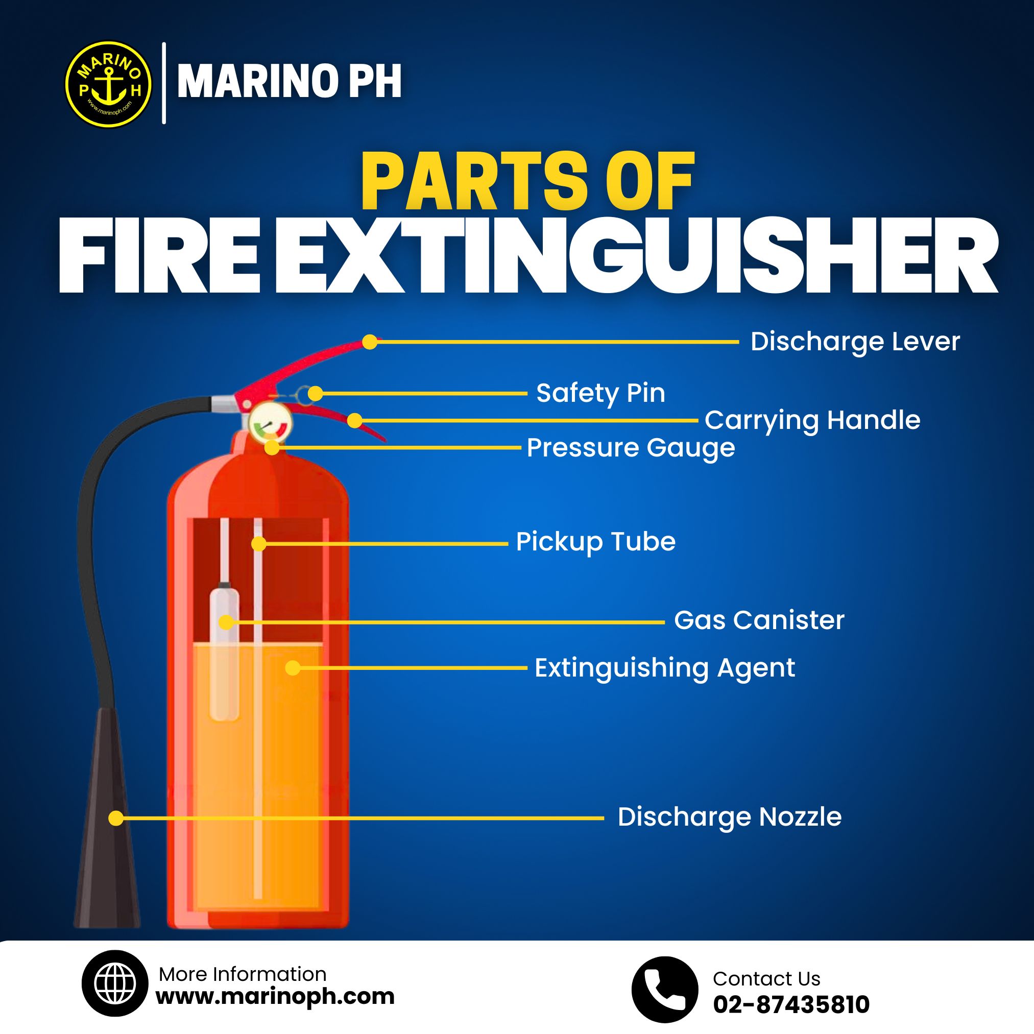 A fire extinguisher is a portable safety device designed to control or put out small fires in emergency situations. It works by releasing a fire-suppressing agent that cools the fire, removes oxygen, or interrupts the chemical reaction of combustion. Fire extinguishers are commonly found on ships, buildings, and industrial areas as part of basic fire-fighting equipment. Main Parts and Their Functions Discharge Lever – When squeezed, it releases the extinguishing agent. Safety Pin – Prevents accidental discharge; must be pulled before use. Carrying Handle – Allows safe handling and control during operation. Pressure Gauge – Indicates whether the extinguisher is properly pressurized and ready for use. Pickup Tube (Siphon Tube) – Draws the extinguishing agent from the bottom of the cylinder. Gas Canister – Contains compressed gas that pushes the extinguishing agent out. Extinguishing Agent – The substance used to fight the fire (e.g., dry powder, foam, CO₂). Discharge Nozzle / Hose – Directs the agent accurately toward the base of the fire. Fire extinguishers are vital first-response tools and must always be properly maintained and correctly used for effective fire control.