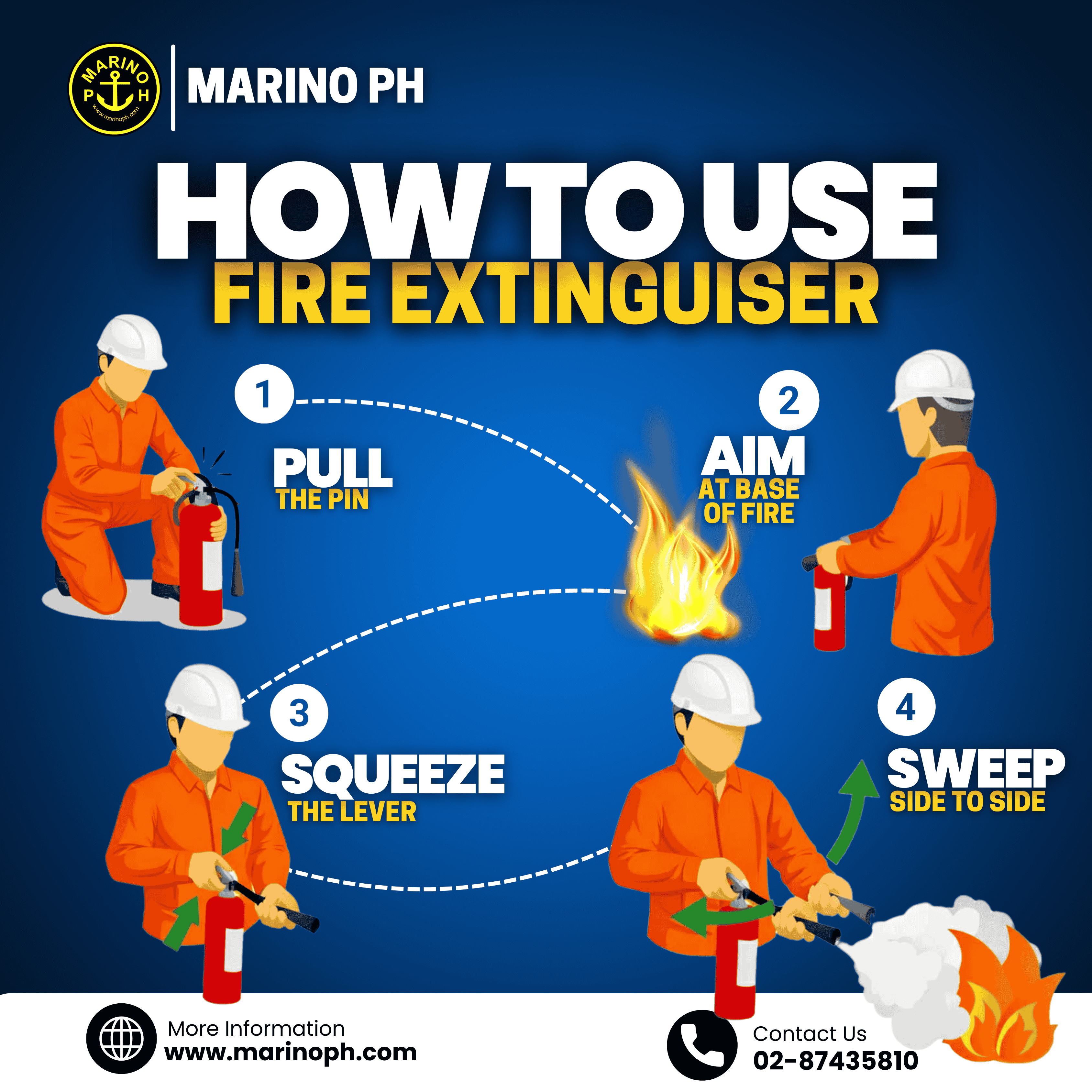 A fire extinguisher is a vital safety device designed to control or extinguish small fires in emergency situations. It works by releasing an agent—such as water, foam, dry chemical, or CO₂—that suppresses the fire, preventing it from spreading and minimizing damage or injury. Fire extinguishers are essential on ships, workplaces, and homes as a first line of defense against fire hazards. Proper operation of a fire extinguisher can be remembered with the PASS method: ‣ Pull – Remove the safety pin to unlock the extinguisher. ‣ Aim – Direct the nozzle at the base of the fire, where it feeds on fuel. ‣ Squeeze – Press the handle to discharge the extinguishing agent. ‣ Sweep – Move the nozzle side to side across the base until the fire is completely out.
