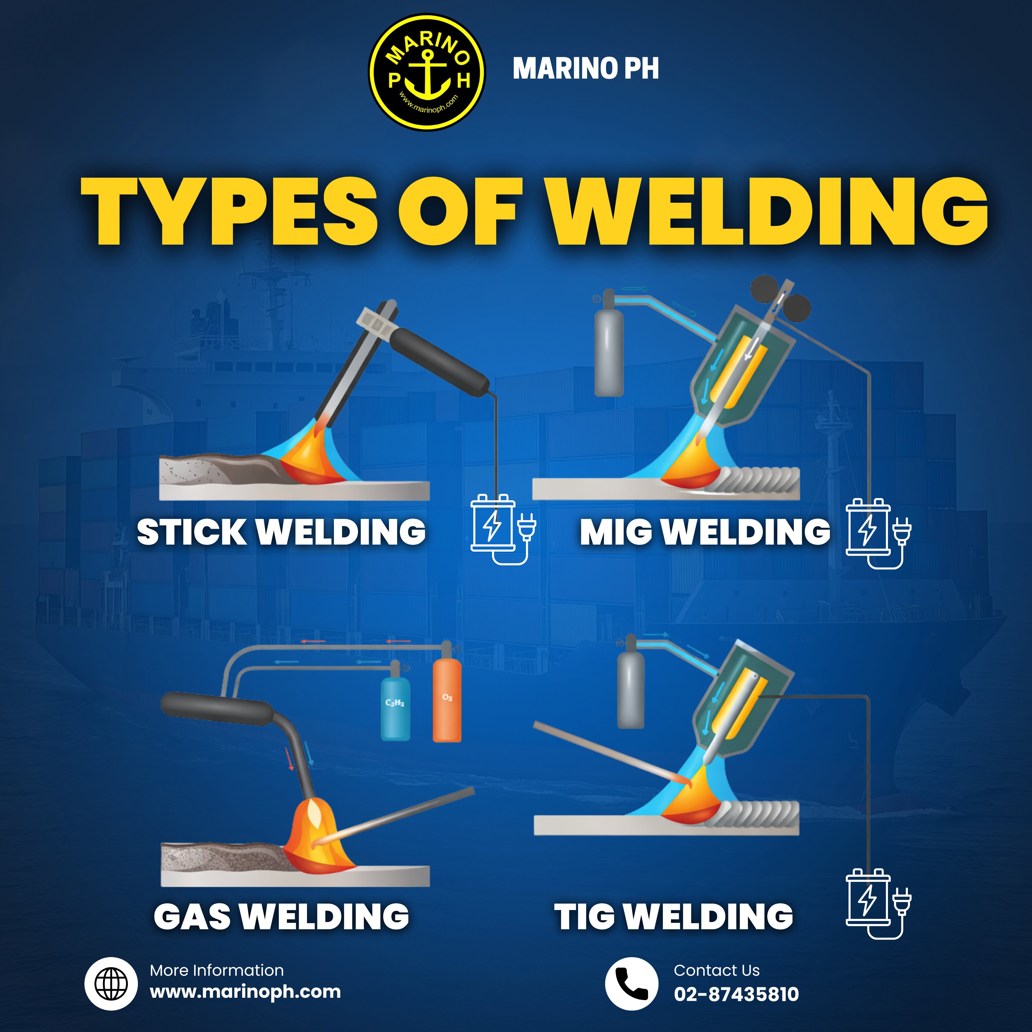 What are the different types of Welding? Welding is a fundamental process in shipbuilding, offshore operations, construction, and heavy industries. It involves joining metals by applying heat, and in some cases pressure, to create a strong and permanent bond. In maritime environments, where structures are constantly exposed to saltwater, pressure, and heavy loads, high-quality welding is essential to ensure structural integrity, operational safety, and long-term durability. Understanding the different types of welding helps professionals select the most suitable method for specific applications. Stick welding also known as Shielded Metal Arc Welding (SMAW), is one of the most commonly used and versatile welding methods. It utilizes a consumable electrode coated with flux, which creates a protective gas shield when melted to prevent contamination of the weld pool. This method is especially effective for outdoor work and in windy conditions, making it highly suitable for ship repairs, structural steel projects, and heavy equipment maintenance. Its portability and ability to perform well on rusty or dirty surfaces make it a preferred choice for fieldwork and marine repair operations. MIG welding Gas Metal Arc Welding (GMAW), uses a continuously fed wire electrode combined with a shielding gas to protect the weld from atmospheric contamination. Known for its speed and efficiency, MIG welding produces clean welds with minimal slag and is relatively easy to learn. It is widely used in fabrication shops, ship component assembly, and industrial production environments where consistency and productivity are important. This method is ideal for controlled indoor settings where high output and smooth finishes are required.