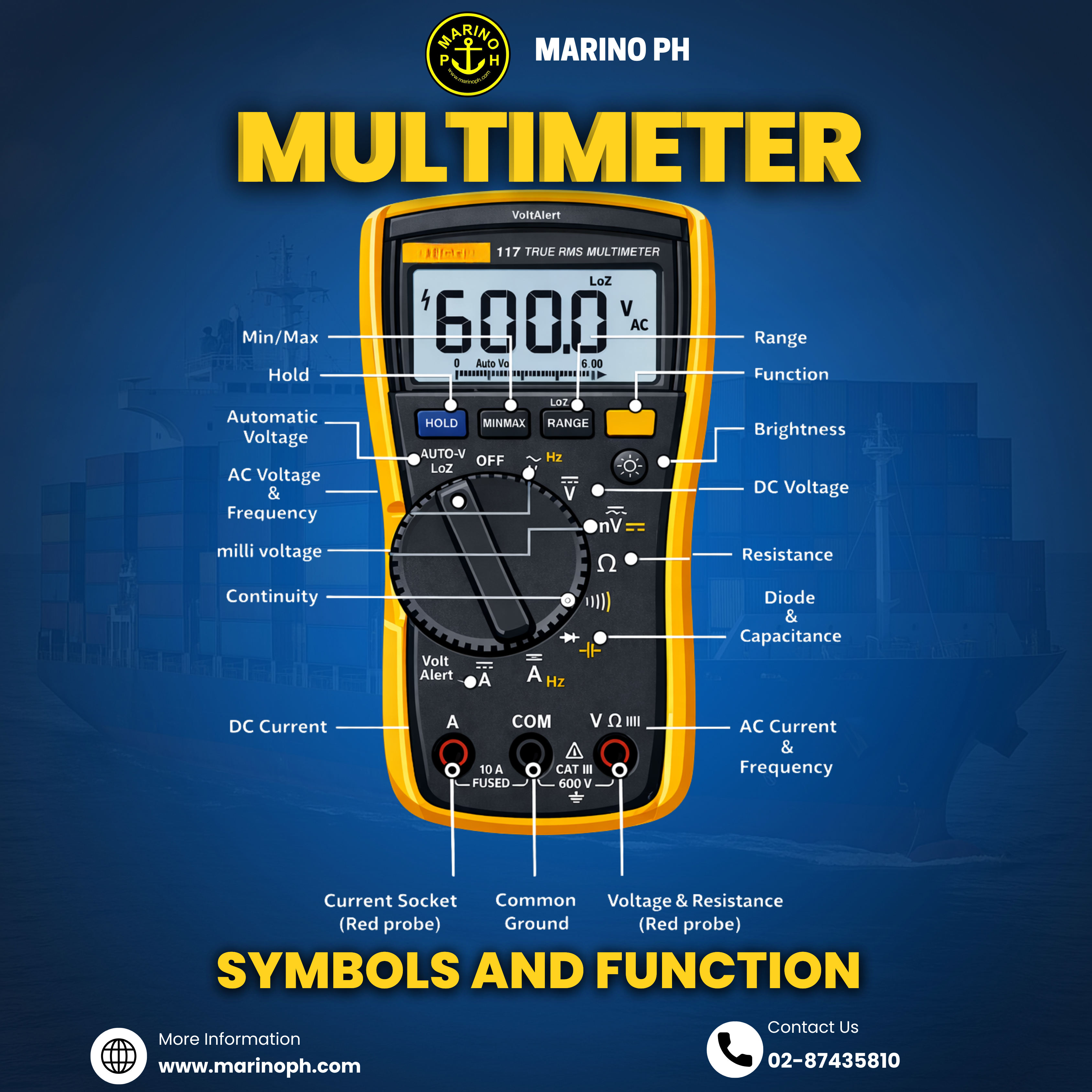 WHAT IS A MULTIMETER A multimeter is an essential diagnostic tool used in marine, electrical, and industrial environments to measure and troubleshoot electrical systems safely and accurately. This visual guide breaks down the key symbols, buttons, and sockets found on a digital multimeter, helping users quickly understand its functions and proper usage. The display section highlights important features such as AC/DC voltage readings, frequency, auto-ranging, hold, and min/max values, allowing precise monitoring of electrical parameters. Control buttons like Hold, Range, Function, and Brightness enhance ease of use, especially in low-light or onboard conditions.