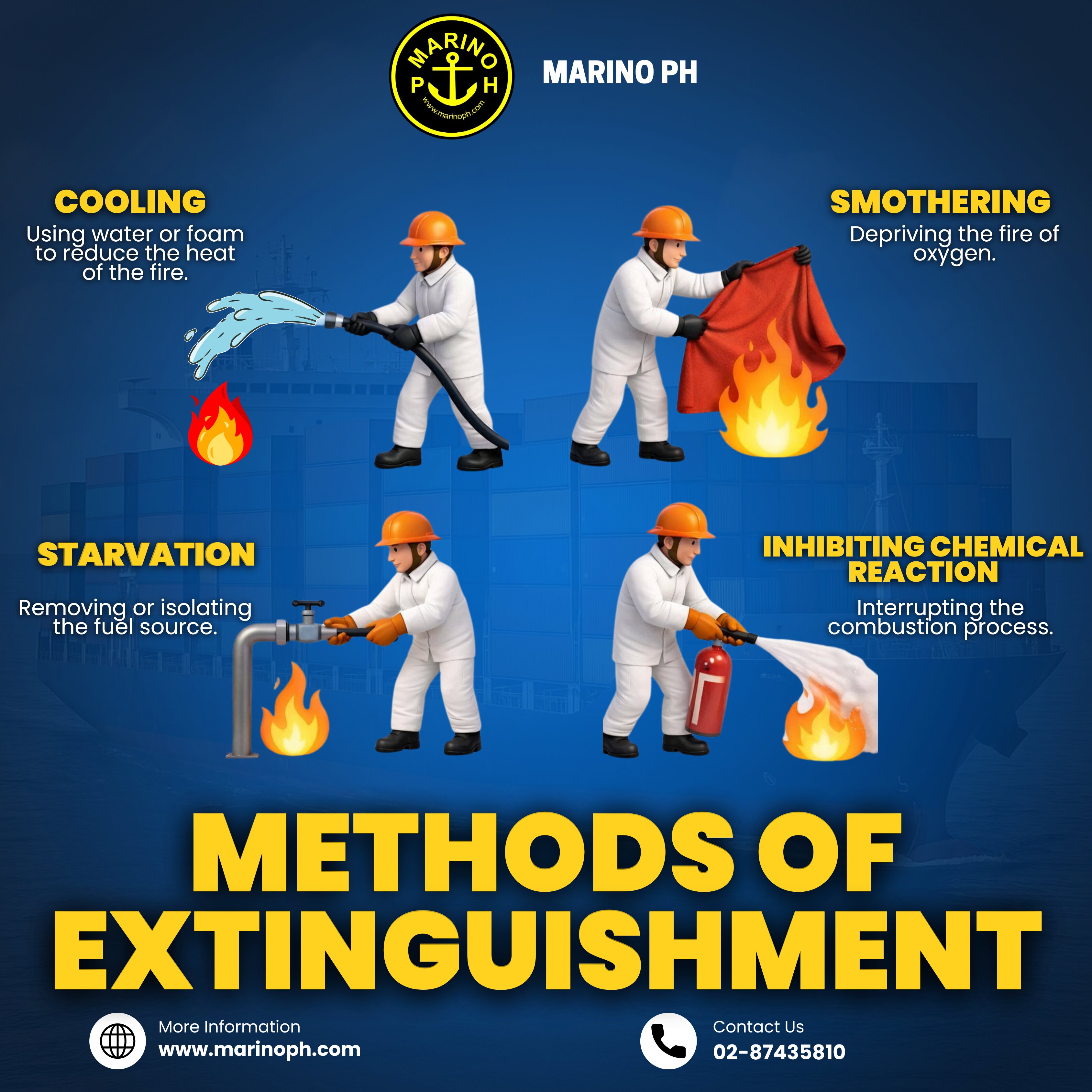 Methods of Fire Extinguishment Fire remains one of the most serious hazards on board ships and offshore installations. Effective firefighting depends on understanding the fire tetrahedron heat, fuel, oxygen, and the chemical chain reaction. By removing or interrupting any of these elements, a fire can be controlled and extinguished. Below are the four primary methods of fire extinguishment used in maritime operations. 1. Cooling Cooling reduces the temperature of the burning material below its ignition point. Water is the most commonly used cooling agent because of its high heat-absorbing capacity. When applied properly, water removes heat from the fire and surrounding surfaces, preventing re-ignition. Foam may also provide a cooling effect while offering additional smothering benefits. Cooling is particularly effective for Class A fires involving solid combustibles such as wood, paper, and textiles. 2. Smothering Smothering works by cutting off the oxygen supply required to sustain combustion. This can be achieved using foam, CO₂, fire blankets, or fixed fire suppression systems. By creating a barrier between the fire and the surrounding air, smothering suppresses flame spread and prevents further combustion. This method is commonly used for liquid fires and enclosed space incidents on board vessels.