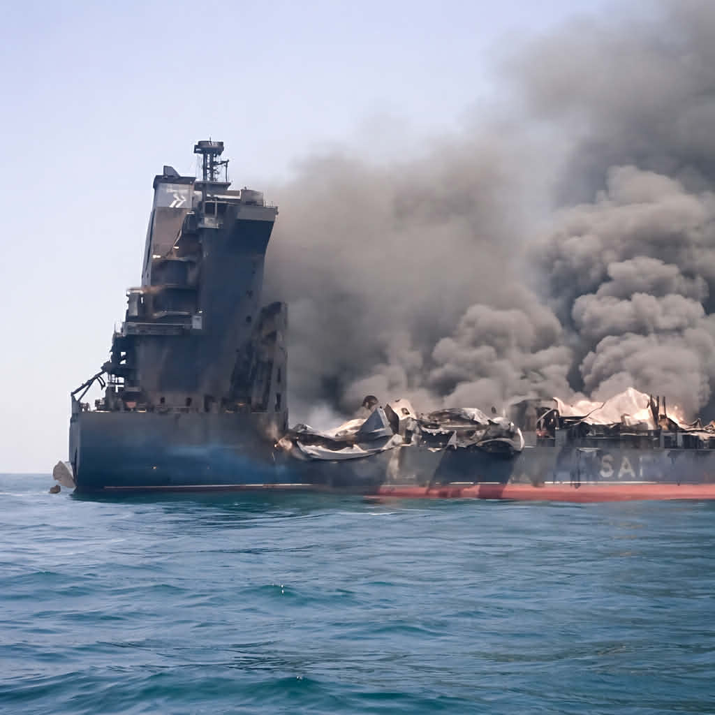 A containership damaged during Iran-related hostilities in March has now sunk off the coast of Oman, according to maritime reports and navigational warnings. The vessel, identified as Safeen Prestige, was struck on March 4, 2026 by a projectile that hit just above the waterline. The impact triggered a fire in the engine room, leaving the ship severely damaged while transiting near one of the world’s most important trade corridors. Despite the initial damage, the vessel remained afloat for several weeks as its condition gradually worsened. Monitoring updates indicated that the structural integrity of the ship continued to decline following the incident. On April 1, 2026, a NAVAREA IX warning confirmed that the containership had sunk, marking one of the most serious recent incidents affecting commercial shipping in the region.