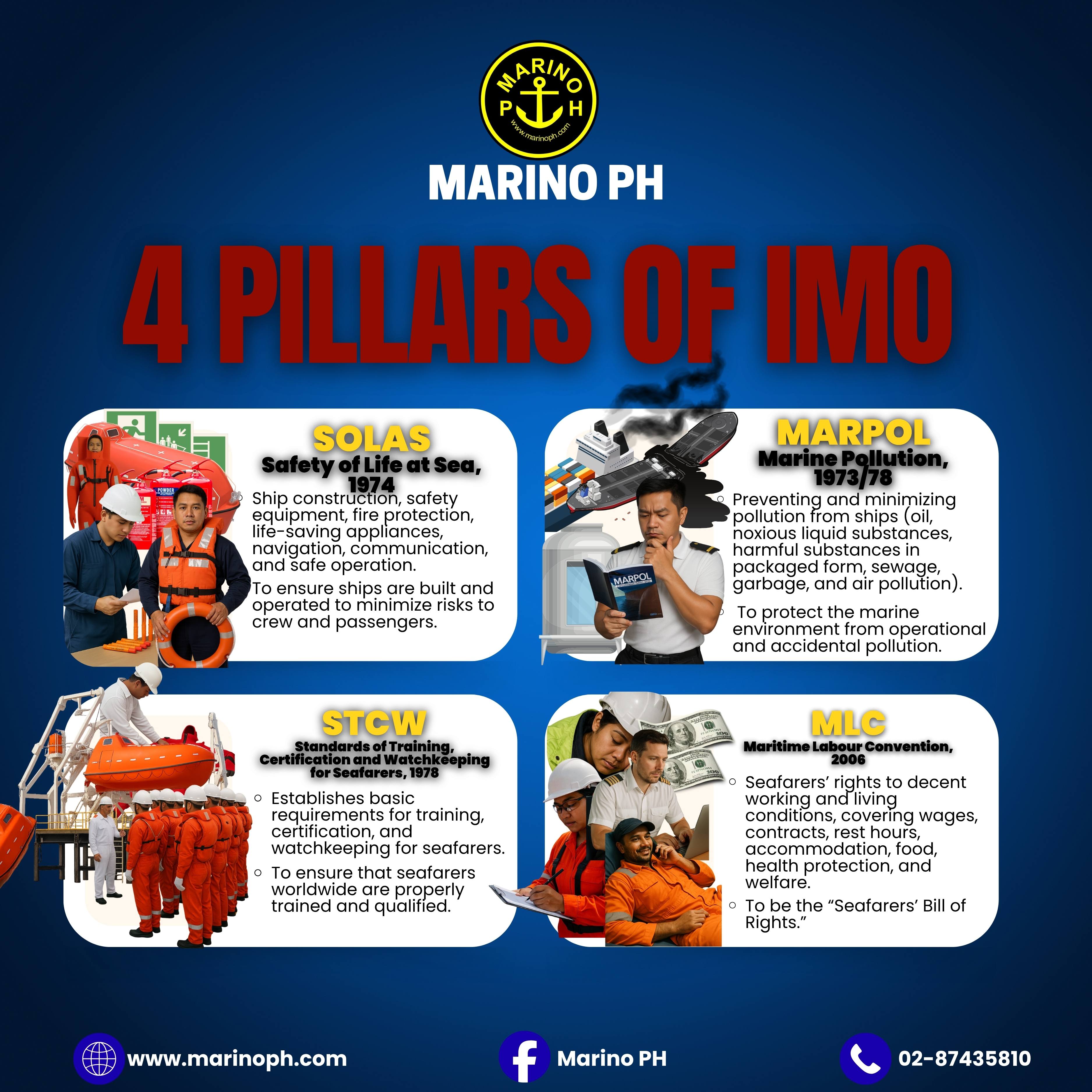 The International Maritime Organization (IMO) establishes global standards to promote safety, protect the marine environment, ensure proper training of seafarers, and safeguard their welfare. These standards are anchored on four key conventions known as the 4 Pillars of IMO: 1. SOLAS – Safety of Life at Sea (1974) SOLAS is considered the most important international treaty concerning maritime safety. It sets the minimum standards for the construction, equipment, and operation of ships to ensure they are safe for both crew and passengers. This includes: • Fire protection systems • Life-saving appliances • Navigation and communication requirements • Emergency preparedness Its ultimate purpose is to prevent loss of lives at sea. 2. MARPOL – Marine Pollution (1973/1978) MARPOL addresses the prevention of pollution from ships. It regulates: • Oil and chemical spills • Sewage and garbage discharge • Air emissions from ships Its goal is to protect the marine and coastal environment by minimizing pollution from ship operations and accidents. 3. STCW – Standards of Training, Certification, and Watchkeeping for Seafarers (1978) STCW sets global training and competency standards for seafarers working on commercial vessels. It ensures: • Seafarers are properly trained, qualified, and certified • Uniform watchkeeping and operational safety practices across the world This helps maintain a high level of professionalism and safety at sea. 4. MLC – Maritime Labour Convention (2006) The MLC is often called the “Seafarers’ Bill of Rights.” It ensures that seafarers have: • Fair wages and employment contracts • Safe working and living conditions • Adequate rest hours • Medical care, social protection, and welfare The convention promotes human rights and dignity for those working at sea.